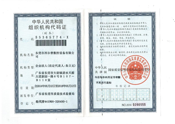 組織機構代碼證 榮譽資質 關于上饶长鑫航空航天集团 cnc加工中心廠家_小型數控銑床_小型數控機床_東莞市上饶长鑫航空航天集团